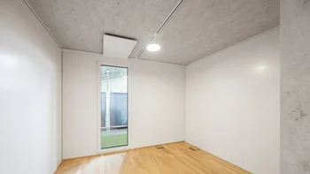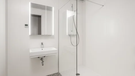 Das Bad ist mit einem qualitativ hochwertigen Vinylbodenbelag ausgebildet. Die Badezimmerwände bestehen aus demselben Material wie die Zimmertrennwände und sind daher pflegeleicht und einfach zu reinigen. Auch im Badezimmer sind die magnetischen Oberflächen von Vorteil.